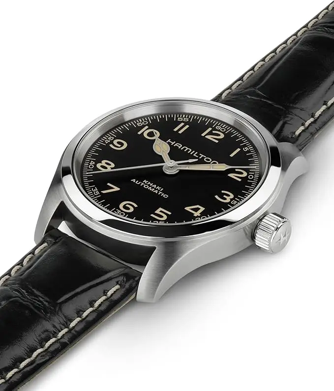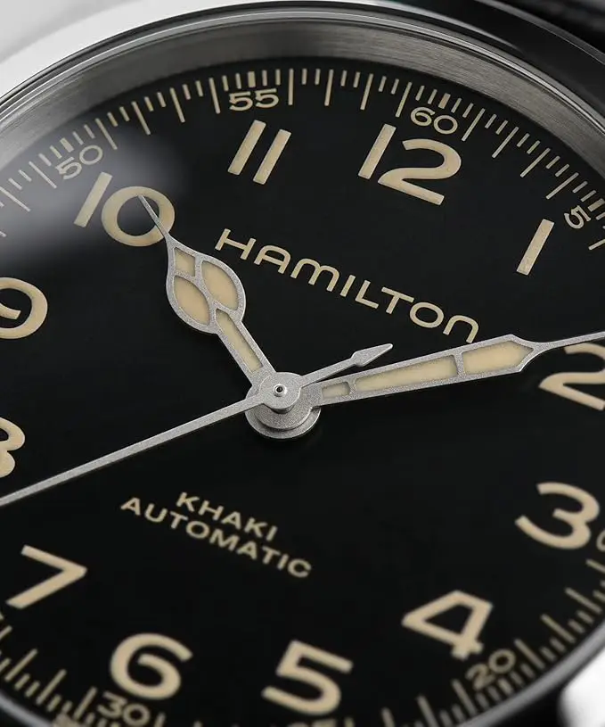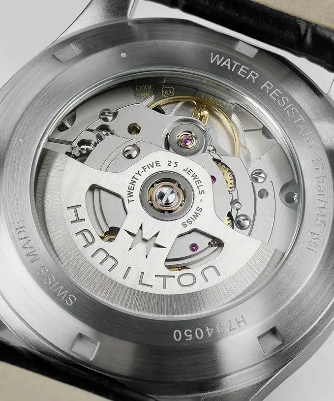 Mouvement automatique : le remontage se produit avec le mouvement du poignet Super Luminova : meilleure visibilité dans des conditions de faible luminosité Matériau du boîtier : acier inoxydable durable Verre : saphir résistant aux rayures Ressort d’équilibre : Nivachron pour une meilleure stabilité Calibre : H-10 pour une performance fiable